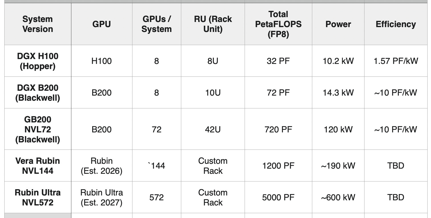 The GB200 NVL72 achieves 81x the raw compute of the DGX H100, while simultaneously improving power efficiency by 6.4x (from ~1.57 to ~10 PetaFLOPS per kilowatt). The roadmap shows NVIDIA’s commitment to continuing this rack-scale expansion, with the Vera Rubin Ultra NVL572 targeting nearly 4x the performance of today’s GB200 NVL72.